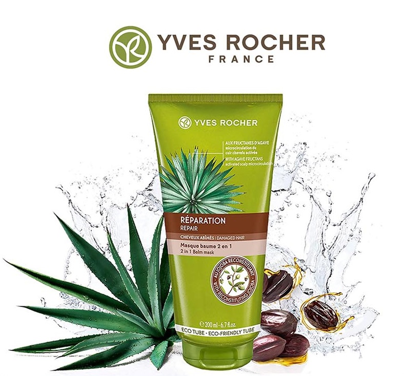 ماسک موی ترمیم کننده ایوروشه Yves Rocher Reparation حاوی عصاره های طبیعی از جمله روغن جوجوبای غنی شده با روغن بادام شیرین تغذیه عمیق و ترمیم موهای آسیب دیده و افزایش 20 برابری استحکام موهای نازک و شکننده می باشد. شرکت ایوروشه گیاهان مورد نیاز محصولات خود را در مزارع خصوصی به صورت ارگانیک پرورش میدهد از جمله جوجوبا و بادام شیرین مورد استفاده در ماسک موی ترمیم کننده ایوروشه. علاوه بر این عصاره کلیدی دیگر این فرمول عصاره ارگانیک گیاه آگاو است که گردش خون کف سر را دو برابر افزایش می دهد و موجب رشد موهایی مستحکم تر می شود. آگاو گیاهی شبیه کاکتوس و آلوئه ورا است که در مکزیک پرورش داده می شود و غنی از فروکتوز می باشد.