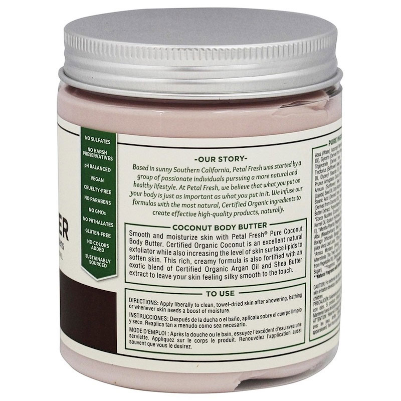 کره بدن نارگیل پتال فرش Petal Fresh Coconut Body Butter مرطوب کننده بسیار قوی بدن و دارای فرمول کاملا طبیعی و ارگانیک می باشد.کره بدن نارگیل پتال غنی شده با انواع روغن های ضروری مورد نیاز پوست می باشد و استفاده از آن حس بسیار خوشایندی همراه با حالت نرمی و ابریشمی پوست به دنبال خواهد داشت.