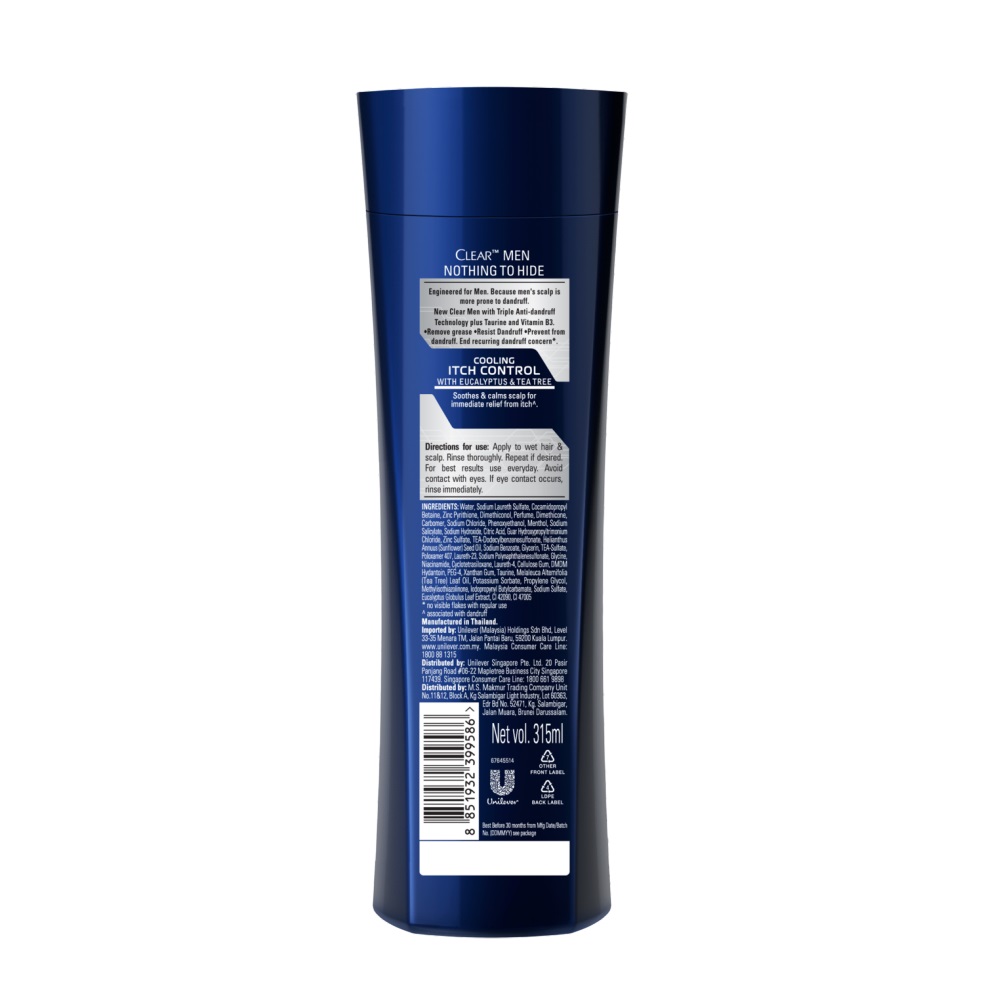 شامپو ضد شوره و ضد خارش جدید آقایان کلیر مدل Clear Cooling Itch Control حاوی عصاره اکالیپتوس و درخت چای بوده و خنک کننده و طراوت بخش پوست سر می باشد. شامپو ضد شوره کلیر Clear Cooling Itch Control حاوی مواد مغذی و ویتامین ها بوده و با تغذیه پوست سر، اثر محافظت کنندگی ادامه دار را توسط سیستم طبیعی پوست سر انجام می دهد. همچنین این شامپو حاوی عصاره اکالیپتوس و درخت چای برای ایجاد حس تازگی و از بین بردن خارش پوست سر می باشد.