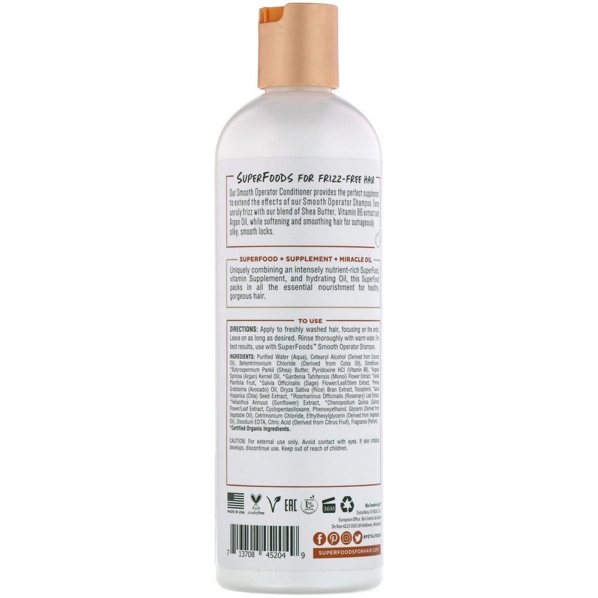 نرم کننده ضد وز مو پتال فرش سوپر فودز Petal Fresh Super Foods Smooth Operator حاوی شی باتر، ویتامین B6 و روغن آرگان می باشد. شی باتر و روغن آرگان دارای خواص آنتی اکسیدانی بوده و صاف کننده، نرم کننده و درخشان کننده می باشد و علاوه بر این ویتامین B6 نیز به عنوان عامل مغذی مو باعث استحکام مو شده و احیای موها را تسریع می کند.