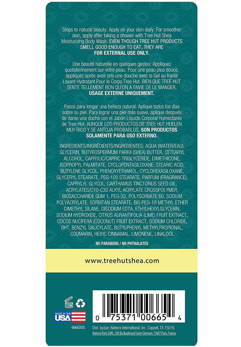 لوسیون بدن آبرسان نارگیل و لیمو تری هات Tree Hut Coconut Lime محصولی فوق العاده جهت رطوبت رسانی قوی و حفظ سلامت و شادابی پوست می باشد. لوسیون بدن تری هات حاوی شی باتر کاملا خالص و ارگانیک بوده که مرطوب کننده عمیق پوست، ترمیم کننده، استحکام بخش و مقابله کننده با فرایند پیری می باشد. علاوه بر این عصاره نارگیل جهت نرم کنندگی عالی و لیمو برای پولیش، پاکسازی و روشن کنندگی پوست در لوسیون بدن تری هات قرار گرفته اند.