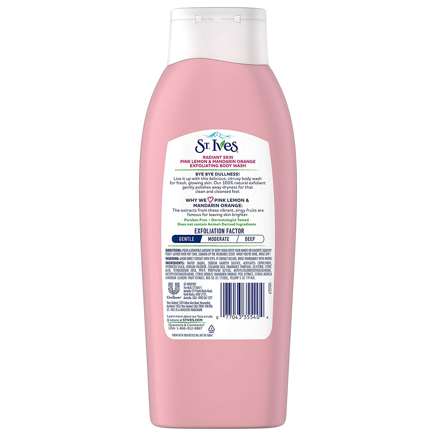 شامپو بدن سینت ایوز St Ives Radiant Skin حاوی عصاره طبیعی لیمو صورتی و پرتقال ماندارین با لایه برداری ملایم می باشد. شامپو بدن سینت ایوز روشن کننده، درخشان کننده و شفاف کننده پوست بوده و از خشکی پوست جلوگیری می کند. لیمو صورتی استفاده شده شامپو بدن سینت ایوز در شرایط ارگانیک در مزارع کالیفرنیا رشد کرده و محصولی کاملا طبیعی می باشد.