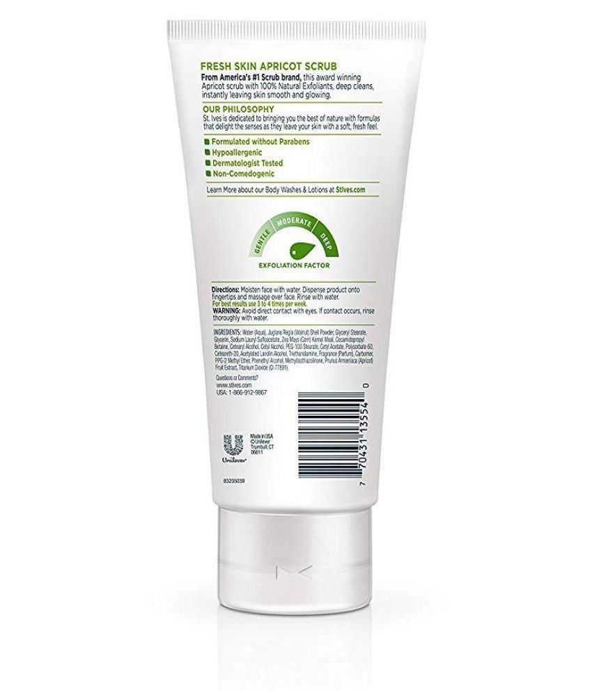 اسکراب زردآلو سینت ایوز St Ives Fresh Skin برنده جایزه متخصصین زیبایی Allure سال 2016 حاوی عصاره ارگانیک زردآلو، دانه زرد و پوست گردو بوده و ضمن پاکسازی پوست شفاف کننده و طراوت بخش می باشد. اسکراب ضدجوش زردآلوی سینت ایوز بدون چربی بوده و همچنین حاوی گلیسیرین جهت نرمی هر چه بیشتر پوست می باشد و برای صورت و بدن قابل استفاده است.