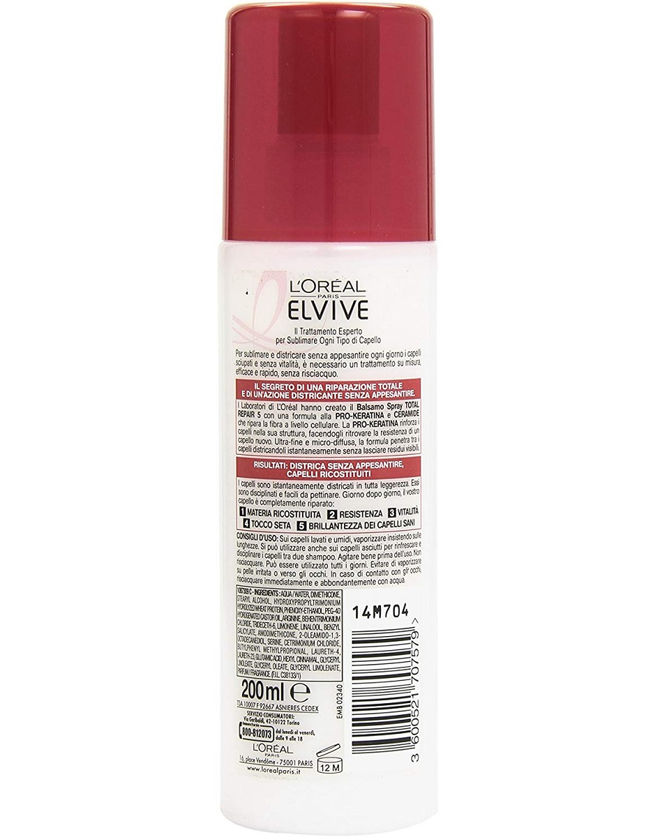 اسپری نرم کننده و ترمیم کننده مو لورآل الویو مدل LOreal Elvive Total Repair حاوی سرامید و کراتین بوده و استحکام فیبر مو را بازسازی کرده و موها را منظم و نرم می کند. اسپری ترمیم کننده لورال الویو دارای 5 عملکرد می باشد: بهبود ساختار مو، استحکام بخشی به مو، سرزندگی مو، نرمی و درخشندگی مو.