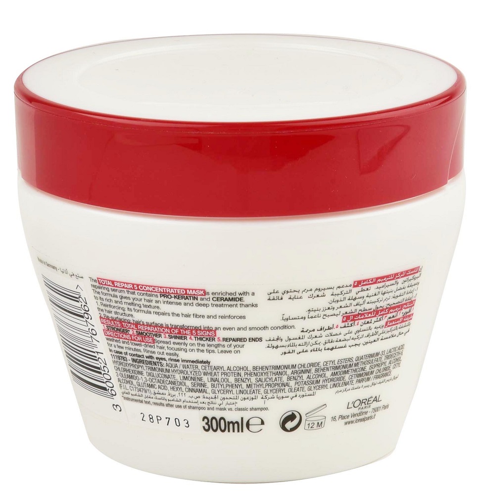 ماسک ترمیم کننده موی لورال توتال ریپیر LOreal Total Repair غنی شده با پرو کراتین و سرامید جهت ترمیم عمیق ساختار مو می باشد. ماسک ترمیم کننده موی لورال دارای پنج عملکرد استحکام بخشی، نرم کنندگی، درخشندگی، ضخامت بخشی و ترمیم انتهای موها می باشد.