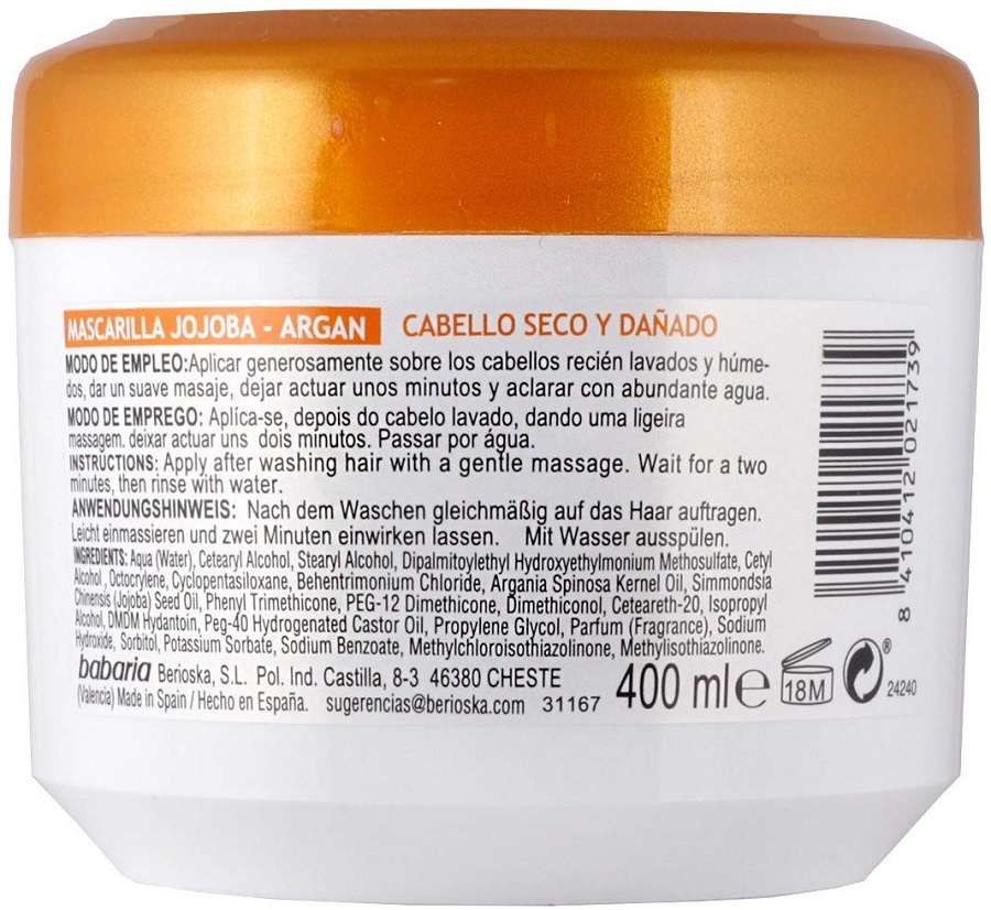 ماسک موی روغن آرگان و جوجوبا باباریا Babaria Reparadora ترمیم کننده موهای خشک و آسیب دیده بوده و موهایی در فرایند رنگ کردن یا فر کردن دچار آسیب شده اند را بازسازی می کند. ماسک موی باباریا همچنین دارای فیلترهای محافظت در برابر پرتوی UV جهت پایداری و حفظ رنگ مو می باشد.