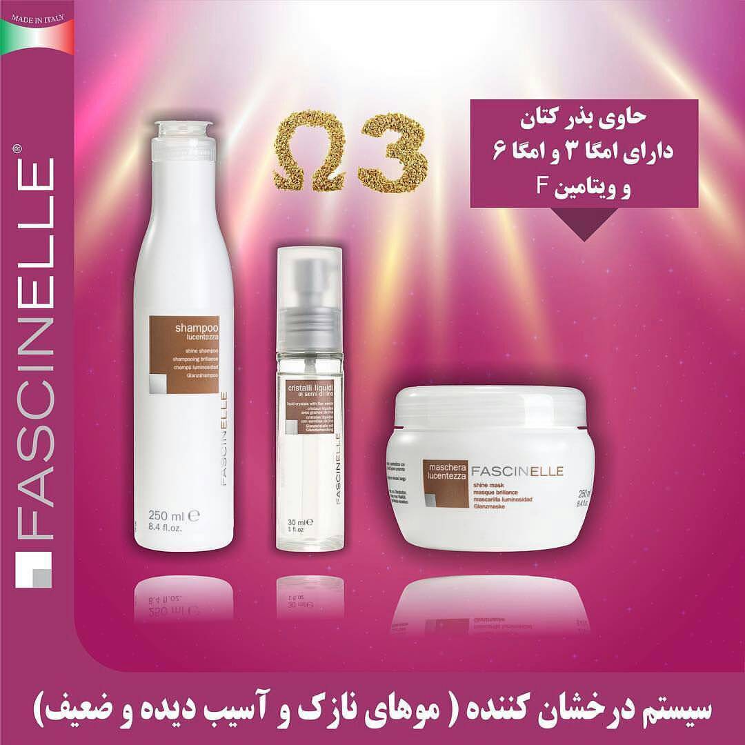 سیستم درخشان کننده (موهای نازک و آسیب دیده و ضعیف) دسته محصولات براق کننده فشینلی با فرمول پیشرفته و بکار بردن بذر گیاه کتان رطوبت مو را افزایش داده و باعث درخشندگی و نرمی مو می شود. شامپو براق کننده فشینلی با دارا بودن لاکتیک اسید و اسید های چرب مفید امگا 3 و امگا 6، موهای آسیب دیده ای را که در انتها دو شاخه شده اند، به حالت اولیه باز می گرداند. همچنین از ایجاد موخوره جلوگیری میکند. تمامی محصولات این دسته فاقد پارابن بوده و برای موهای آسیب دیده و سوخته بسیار مناسب می باشد.