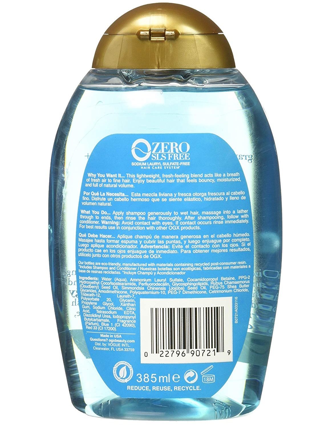 شامپو اکسیژن رسان او جی ایکس Ogx O2 دارای فرمول سبک و حاوی تکنولوژی اکسیژن رسانی به ساختار موها جهت حفظ سرزندگی و سلامتی موها می باشد. شامپو اکسیژن ارگانیکس همچنین حاوی روغن میوه تمشک شمالی (کلود بری) گیاه بومی مناطق سردسیر شمالی از جمله کانادا و آلاسکا است که تغذیه مو را به خوبی انجام می دهد و منجر به رطوبت رسانی، حجم دهی و حفظ سلامت موها می شود.
