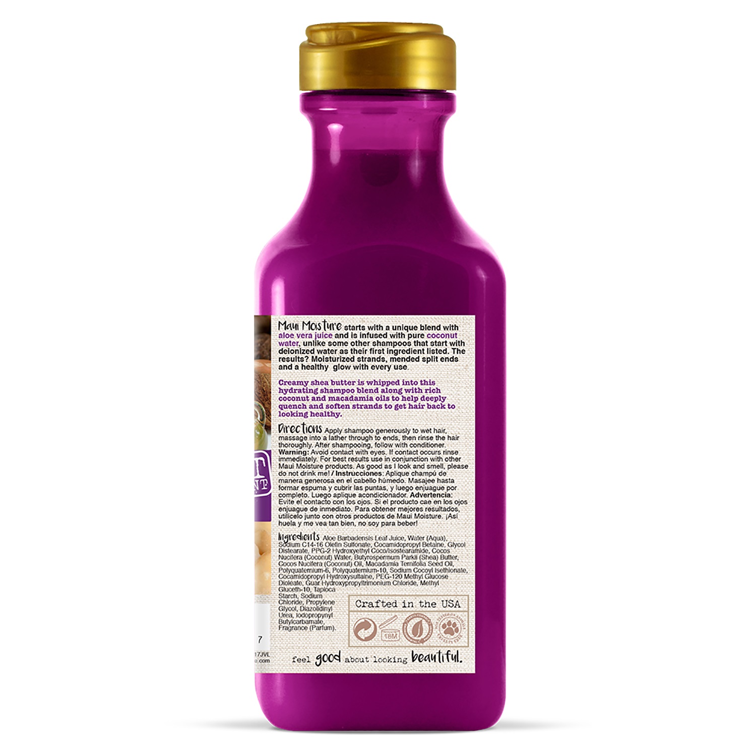 شامپو آبرسان و ترمیم کننده شی باتر مائوئی مویسچر Maui Shea Butter حاوی شی باتر کرمی به همراه روغن نارگیل غنی و روغن ماکادمیای (فندق استرالیایی) خالص جهت تغذیه و آبرسانی عمیق مو و احیای سلامتی آن می باشد. این فرمول به طور عمیق رطوبت از دست رفته موهای خشک را مجددا پر می کند و نرمی و شادابی موهای آسیب دیده را احیا می کند، نتیجه موهایی سالم و سرزنده با نمای شاداب و نرم می باشد. شامپو شی باتر مائوئی مویسچر فاقد سولفات، سیلیکون، پارابن و گلوتن است و فرمول کاملا گیاهی و وگن دارد.