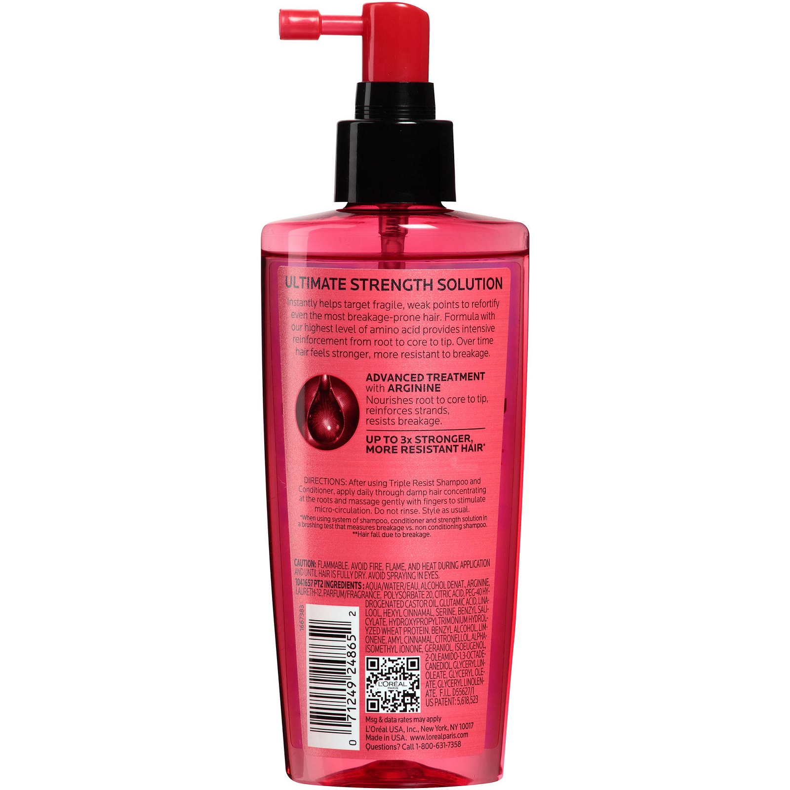 اسپری استحکام بخش موی لورال تریپل رزیست LOreal Triple Resist حاوی آرژنین و فرموله شده با بیشترین مقدار آمینو اسیدها جهت تقویت قوی مو از ریشه تا انتها می باشد. اسپری استحکام بخش موی لورال برای موهای شکننده، نازک و موهایی که با شانه کردن به راحتی کنده می شوند مناسب است و تقویت ساختار و ریشه مو 3 برابر استحکام بخشی مو را افزایش می دهد و موهای مستحکم تر و مقاوم در برابر شکنندگی و کنده شدن را به ارمغان می آورد.